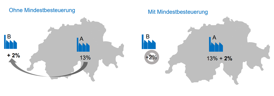 Die Schweiz hat vor, diese Besteuerung selbst sicherzustellen und damit nicht Steuersubstrat ans Ausland abzutreten. Erreicht werden soll dies mit einer sogenannten «Ergänzungssteuer» auf Stufe Bund, welche zum Tragen kommt, wenn die geforderten 15 % nicht erreicht werden.