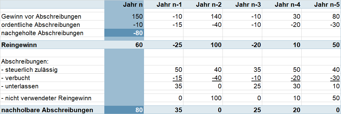 Nach Art. 14 der Abschreibungsverordnung (AbV) ist bei natürlichen und juristischen Personen die Nachholung von Abschreibungen für die fünf der Steuerperiode vorangegangenen Jahre zulässig. Dies sofern wegen schlechten Geschäftsganges nicht oder nur ungenügend abgeschrieben werden konnte.