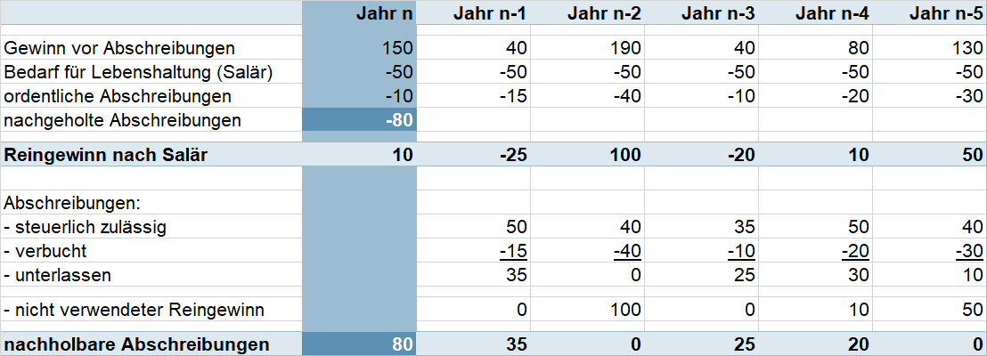 Der Nachholbedarf ist auf der Basis der Abschreibungssätze zu bestimmen, die gemäss Abschreibungsverordnung des betreffenden Jahres zulässig waren. Die nachzuholenden Abschreibungen sind um den Gewinn des Geschäftsjahres zu kürzen, in dem die Abschreibung unterlassen wurde. Eine Kürzung unterbleibt für Gewinne aus der Auflösung stiller Reserven sowie bei Personenunternehmen für Gewinne im Rahmen des Zwangsbedarfs für die Lebenshaltungskosten.