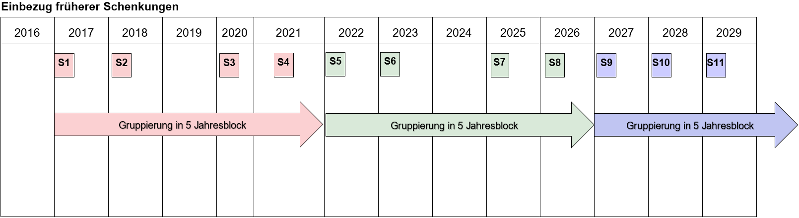 Die Fünf-Jahre-Regel von ESchG 20 I führt dazu, dass «blockweise» besteuert und bemessen wird. Mit der ersten Schenkung beginnt der Block von fünf Jahren (Schenkungen S1 bis und mit S4). Eine Schenkung im Jahr 2022 (S5) gehört mithin in den nächsten Fünf-Jahres-Block und wirkt nicht zurück auf Schenkungen S1 bis S4.